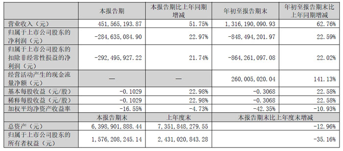 第三季度實現(xiàn)營業(yè)總收入4.52億元,同比增長52.48%;歸母凈利潤虧損2.85億,虧損同比縮小22.97%;扣非凈利潤虧損2.92億,虧損同比縮小21.74%。