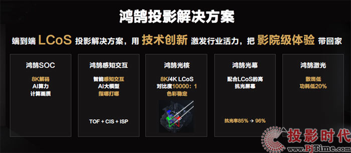 再例如,我國投影產(chǎn)業(yè)占全球產(chǎn)能多一半,國內(nèi)亦是全球第一大投影消費(fèi)市場(chǎng)。但是,在關(guān)鍵的光閥器件和高端投影市場(chǎng),我國企業(yè)占比依然較少。高端工程投影、數(shù)字電影放映機(jī)和高端家庭影院投影,我國品牌的全球市場(chǎng)份額不到2成。2024年初,海思推出3LCOS技術(shù)為核心的鴻鵠投影解決方案就是為了突破這一難題。