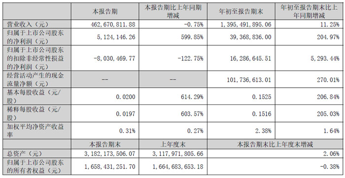 第三季度實現(xiàn)營收30.19億元,同比增長3.33%,環(huán)比增長0.11%;歸母凈利潤1.08億元,同比增長26.11%,環(huán)比下降19.80%;扣非凈利潤1.29億元,同比增長87.47%,環(huán)比增長0.05%。