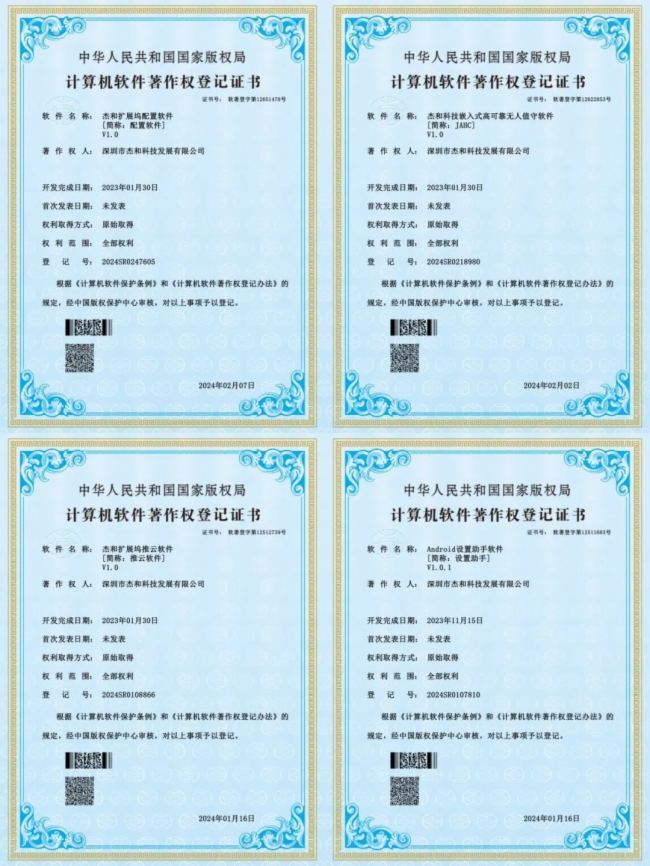 在科技創(chuàng)新的道路上,杰和科技從未停止前進(jìn)的腳步。截至2024年10月,杰和科技今年在科研上取得了顯著成就。今年共榮獲10項(xiàng)實(shí)用新型專利,2項(xiàng)外觀設(shè)計(jì)專利,取得4項(xiàng)軟件著作權(quán),還有5項(xiàng)發(fā)明公開待授權(quán)。