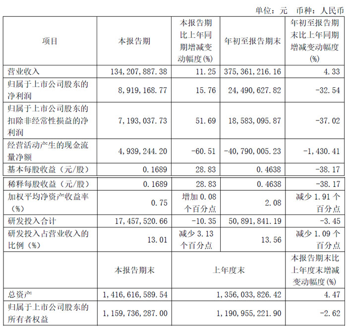 第三季度實(shí)現(xiàn)營(yíng)收1.34億元,同比增長(zhǎng)11.25%;歸母凈利潤(rùn)891.92萬(wàn)元,同比增長(zhǎng)15.76%;扣非凈利潤(rùn)719.30萬(wàn)元,同比增長(zhǎng)51.69%。