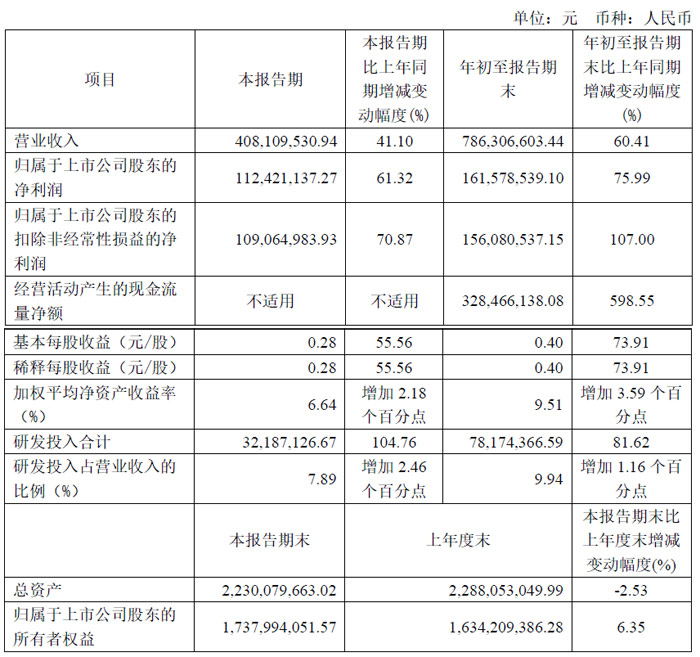 其中,第三季度營(yíng)收4.08億元,同增41.1%。歸母凈利潤(rùn)1.12億元,同增61.32%。扣非凈利潤(rùn)1.09億元,同增70.87%。