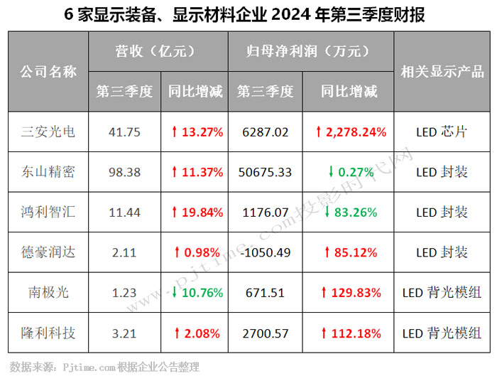 10月29日,三安光電、東山精密、鴻利智匯、德豪潤達、南極光、隆利科技6家LED企業(yè)發(fā)布2024年第三季度財報。