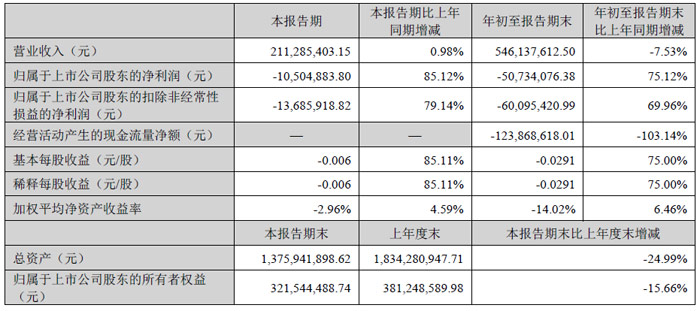 第三季度實現(xiàn)營業(yè)總收入2.11億元,同比增長0.98%;歸母凈利潤-1050.49萬元,同比增長85.12%;扣非凈利潤-1368.59 萬元,同比增長79.14%。