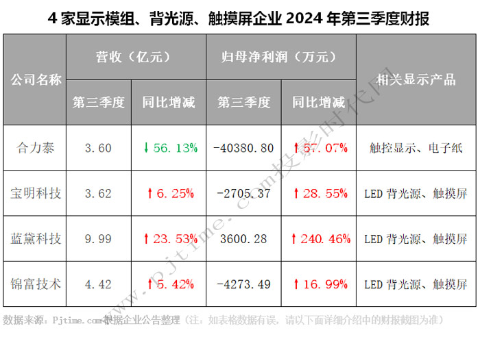 截止到10月30日晚,合力泰、寶明科技、藍(lán)黛科技、錦富技術(shù)披露2024年第三季度財(cái)報(bào)。
