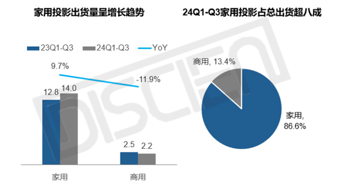 2024年步入最后一個季度,IMF預(yù)測的全年經(jīng)濟(jì)增速連續(xù)三個季度穩(wěn)定在3.2%的低速增長水平,宏觀經(jīng)濟(jì)面呈輕微波動。暑期體育賽事的備貨Q2基本完成,Q3以消化庫存為主,24Q3全球投影出貨同比增速放緩,出貨量5.7M,同比增長3.7%。就24年至今而言,投影憑借其低價便攜的特點以及夏季體育賽事的助力依舊維持增長。據(jù)DISCIEN(迪顯)統(tǒng)計數(shù)據(jù),24年前三季度全球投影出貨量16.2M,同比增長6.2%。