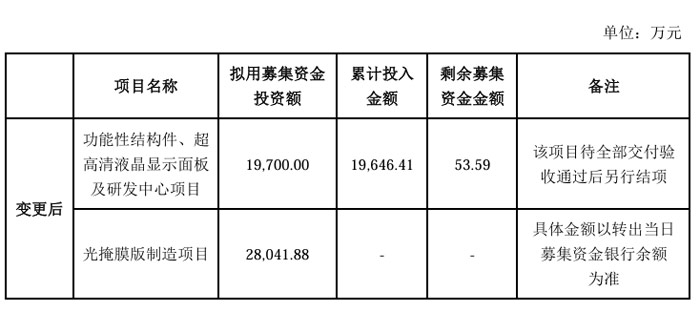 其中,“功能性結(jié)構(gòu)件、超高清液晶顯示面板及研發(fā)中心項(xiàng)目”擬用募集資金投資額為19,700.00萬(wàn)元,“光掩膜版制造項(xiàng)目”擬用募集資金投資額為28,041.88萬(wàn)元。