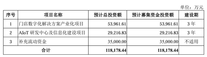 招股書顯示,此次漢朔科技 IPO 擬公開(kāi)發(fā)行不超過(guò) 9,504 萬(wàn)股股票,募資 11.82 億元,主要投向“門店數(shù)字化解決方案產(chǎn)業(yè)化項(xiàng)目”、“AIoT研發(fā)中心及信息化建設(shè)項(xiàng)目”和“補(bǔ)充流動(dòng)資金”等三個(gè)項(xiàng)目。本次募集資金擬投資項(xiàng)目,均圍繞公司主營(yíng)業(yè)務(wù)開(kāi)展,是對(duì)公司現(xiàn)有產(chǎn)品產(chǎn)能的進(jìn)一步升級(jí)與擴(kuò)充,旨在增強(qiáng)公司技術(shù)實(shí)力,鞏固和提高市場(chǎng)地位,推動(dòng)可持續(xù)發(fā)展,提升公司的整體競(jìng)爭(zhēng)力。