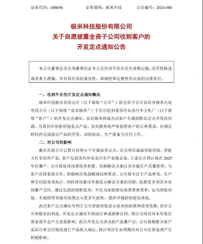 極米科技于12月14日發(fā)布公告,其全資子公司宜賓市極米光電有限公司(簡(jiǎn)稱(chēng)“宜賓極米”)近日收到某國(guó)內(nèi)知名汽車(chē)主機(jī)廠的開(kāi)發(fā)定點(diǎn)通知,宜賓極米將成為該客戶(hù)車(chē)載投影儀及幕布定點(diǎn)開(kāi)發(fā)供應(yīng)商,為其供應(yīng)智能座艙顯示產(chǎn)品。自今年年初成立車(chē)載事業(yè)部以來(lái),極米科技已獲得6個(gè)車(chē)載業(yè)務(wù)定點(diǎn),涉及智能座艙和智能大燈部件,客戶(hù)包括國(guó)內(nèi)外知名汽車(chē)企業(yè)。預(yù)計(jì)這些項(xiàng)目將于2025年實(shí)現(xiàn)量產(chǎn)。