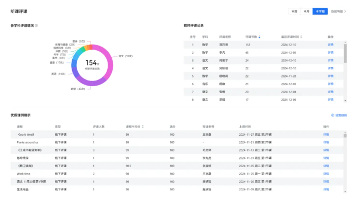 針對這一問題,玄武路小學(xué)利用希沃魔方的聽評課功能,實(shí)現(xiàn)了“雙軌”研課:線上聽課與線下評課相結(jié)合,教師可以通過電腦或手機(jī)端輕松完成聽評課操作,實(shí)時(shí)評論,大幅提升聽評課的溝通效率。這種方式,不僅打破了時(shí)間和空間的限制,還促進(jìn)了教師之間的深度交流和專業(yè)成長。在已完成的近2000次聽評課中,平臺(tái)的自動(dòng)化數(shù)據(jù)記錄和分析功能,成功幫助教師們能夠及時(shí)獲得多方反饋,更好地總結(jié)經(jīng)驗(yàn)、改進(jìn)教學(xué)方法,有效推動(dòng)了教師的專業(yè)成長,提升了學(xué)校整體教學(xué)水平。
