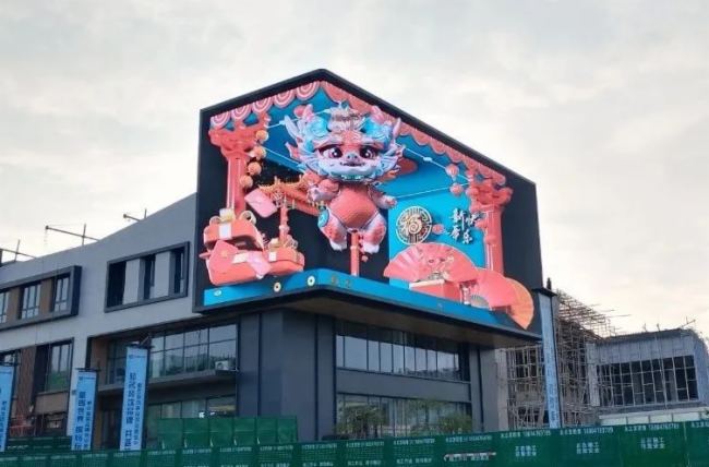 總面積270㎡的LED大屏幕上,一個個生動的3D圖景躍然而出:吉祥龍帶來新年的祝福、大魚缸中海洋生物沖屏而出……震撼十足的視聽效果撲面而來,讓人身臨其境感受著近乎真實的沉浸式全感官體驗,這種藝術內容呈現(xiàn)方式,使品牌廣告價值得到極大的提升。