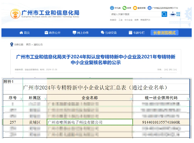 近日,廣州市工業(yè)和信息化局關(guān)于2024年擬認(rèn)定專精特新中小企業(yè)認(rèn)定名單公布,廣州市唯圖新電子科技有限公司成功獲得認(rèn)定。