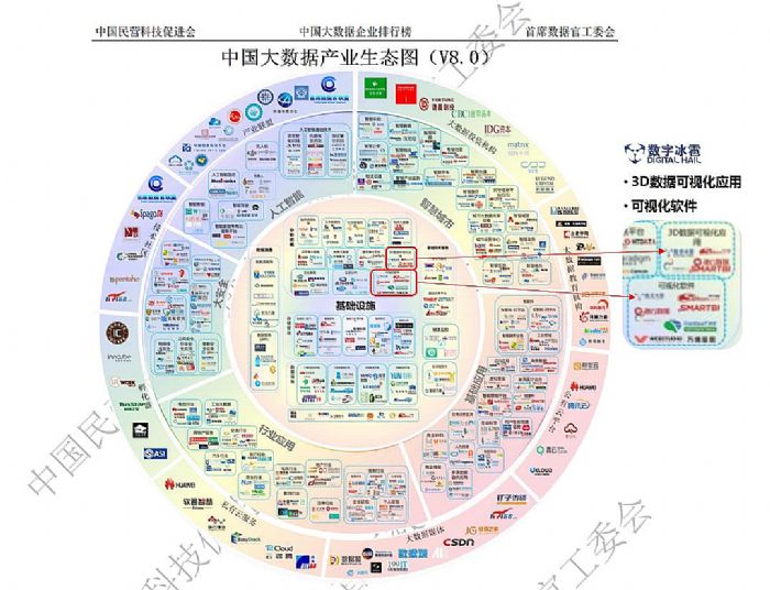 在《2023中國大數(shù)據(jù)優(yōu)質(zhì)企業(yè)榜V8.0(大數(shù)據(jù)產(chǎn)業(yè)白皮書)》中,對(duì)截至2023年12月31日,中國5000余家大數(shù)據(jù)企業(yè)進(jìn)行了梳理總結(jié),發(fā)布了“中國大數(shù)據(jù)產(chǎn)業(yè)生態(tài)圖(V8.0)”,覆蓋了中國大數(shù)據(jù)產(chǎn)業(yè)生態(tài)鏈上的各個(gè)重要環(huán)節(jié)。數(shù)字冰雹入選“3D可視化應(yīng)用”和“可視化軟件”板塊。