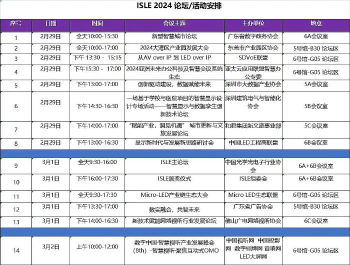 2月29-3月2日,ISLE主辦方將與多個重量級行業(yè)協(xié)會、權(quán)威機構(gòu)聯(lián)手,舉辦多場峰會論壇,邀請政界、學界、企業(yè)界知名專家學者就當前行業(yè)形勢、市場動態(tài)展開論壇研討。內(nèi)容涵蓋顯示技術(shù)、智慧城市、數(shù)字智能、智慧教育、智慧醫(yī)療等多個領(lǐng)域,圍繞最新市場發(fā)展趨勢及市場機遇進行分析,探討新創(chuàng)意、新理念、新策略、新途徑、新發(fā)展,為行業(yè)獻上年度新思維盛宴。