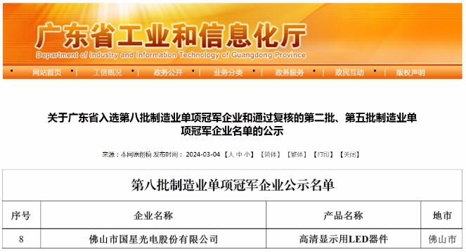 近日,廣東省工業(yè)和信息化廳公布了國家第八批制造業(yè)單項冠軍企業(yè)名單,國星光電憑借自主研發(fā)的“高清顯示用LED器件”成功上榜,公司自主創(chuàng)新能力及產(chǎn)品實力獲得國家級認可,高質(zhì)量發(fā)展再添新佳績。