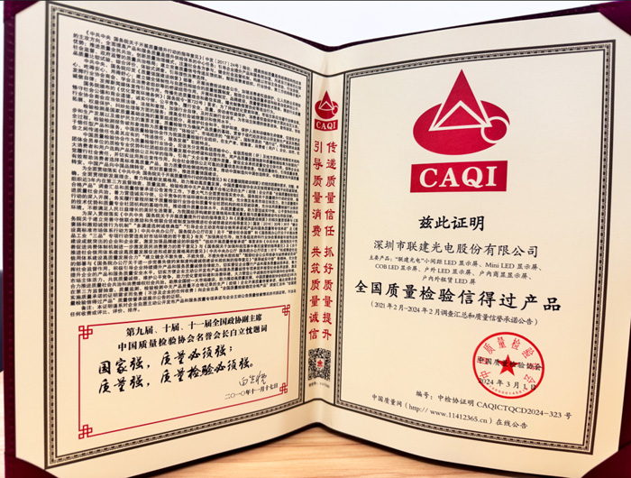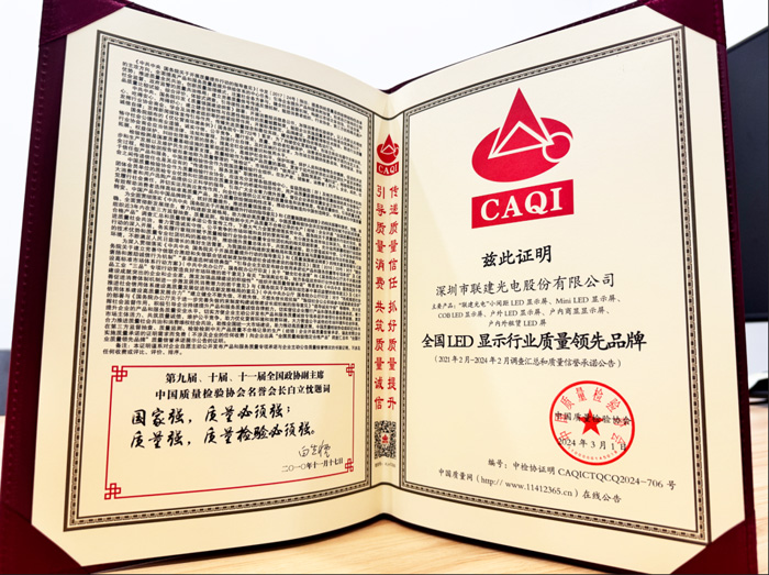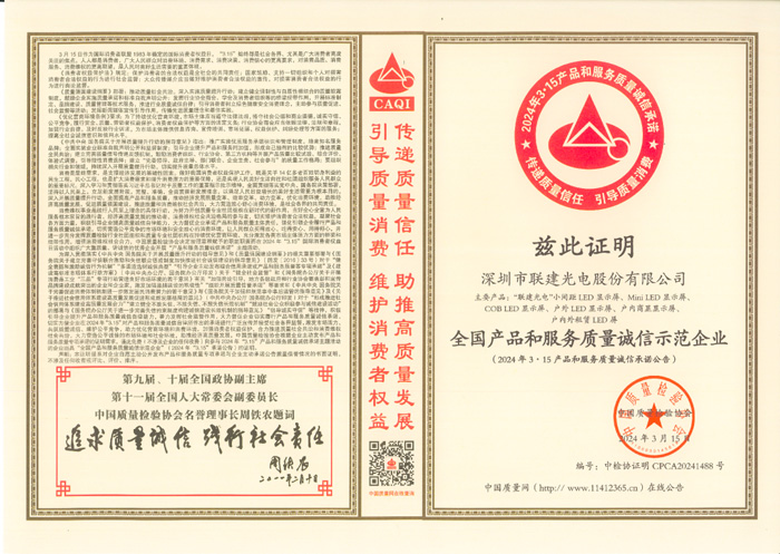 聯建光電已連續(xù)多年斬獲該榮譽,這是行業(yè)權威機構對聯建光電品質的充分認可,也是社會對聯建光電在提升國家質量競爭力和促進質量強國建設中所做貢獻的肯定。