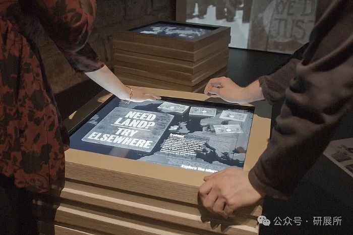 設(shè)計(jì)師將互動(dòng)屏設(shè)置成一系列的“堆!保Q其為“故事井”。觀眾可從向下進(jìn)行窺看關(guān)于愛(ài)爾蘭“家庭”、“土地”和“勞工”的內(nèi)容。