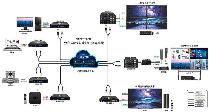 越來越多的用戶希望將運營管理、會議通訊、生產調度、安全監(jiān)控、應急指揮等眾多系統(tǒng)進行整合,實現計算機、平板、攝像機、多媒體盒子等諸多設備的音視頻、USB及控制信號遠程傳輸至大屏幕呈現,各種屏與屏之間能夠無縫互動,形成一個有效的信息共享的操作平臺。為了滿足這一市場的需求,維摩科技通過多年來對技術的深入研究和對用戶習慣的調研,推出了VMORETECH IPJ-4K分布式KVM多功能IPJ矩陣切換系統(tǒng)。