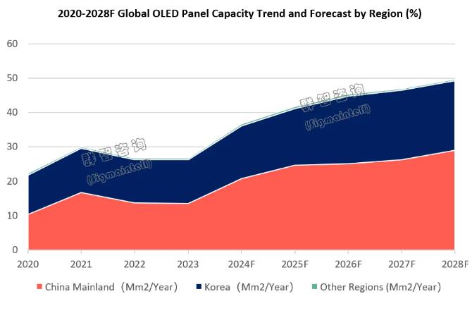 2023年,由于韓系OLED 電視面板的出貨不達(dá)預(yù)期,使得全球OLED面板出貨面積呈現(xiàn)下降趨勢。但是以中國大陸市場來看,受到OLED面板在手機(jī)廠商的大幅滲透,中國市場OLED面板出貨呈現(xiàn)上漲態(tài)勢。群智咨詢(Sigmaintell)數(shù)據(jù)顯示,2023年中國大陸地區(qū)OLED面板產(chǎn)能占比達(dá)51%,韓國為48%,全球OLED面板95%以上的產(chǎn)能都集中在中國大陸及韓國。2023年中國OLED面板出貨面積約305萬平方米,同比增長約58%。當(dāng)前OLED面板已逐漸成為智能手機(jī)面板的標(biāo)配, 2023年全球智能手機(jī)OLED面板出貨約為6.8億片,滲透率達(dá)32%。隨著京東方官宣大世代OLED線體規(guī)劃落地,中尺寸OLED屏幕的成本有望進(jìn)一步下降,OLED技術(shù)能力也將進(jìn)一步提升和優(yōu)化,并逐漸加速在平板電腦、筆記本電腦等中尺寸應(yīng)用上的滲透率,其應(yīng)用場景和市場邊界不斷拓展,預(yù)計(jì),全球OLED IT面板(顯示器、筆電及平板)出貨滲透率將從2023年的2%提升至2030年的22%,預(yù)計(jì)OLED TV面板滲透率將從2023年的2%上升至2030年的6%。進(jìn)而帶動(dòng)中國市場的OLED有機(jī)材料的需求,群智咨詢(Sigmaintell)調(diào)研測算,2023年中國市場OLED有機(jī)材料的市場規(guī)模約43億元,同比增長約33%,隨著OLED在中大尺寸的滲透以及材料國產(chǎn)化趨勢,未來市場規(guī)模仍然呈現(xiàn)高速增長態(tài)勢,預(yù)計(jì)2030年中國市場OLED有機(jī)市場規(guī)模將達(dá)到98億元,2023年到2030年的復(fù)合增長率為11%,持續(xù)保持快速增長態(tài)勢。