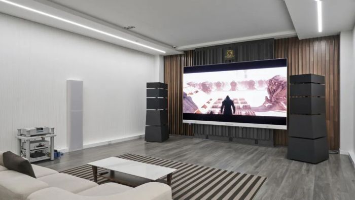 此次發(fā)布會(huì),創(chuàng)顯光電 CreateLED 重磅推出了145寸和163寸的新一代 MicroLED 家庭影院(Lifestyle Cinema),而 Goldmund 則展示了旗艦音響 Gaïa 系列,兩者的結(jié)合堪稱視聽技術(shù)與設(shè)計(jì)美學(xué)的完美融合,共同打造出了可能是全球最頂級(jí)、最豪華的家庭影院展廳。