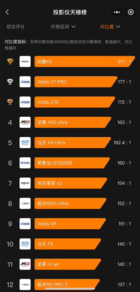 哈趣K2對比度遙遙領(lǐng)先,比肩萬元級旗艦品牌投影儀