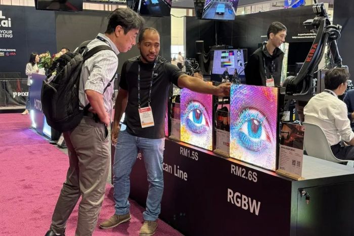 與世界頂尖AI巨頭合作之外,奧拓電子自身的展位也同樣備受矚目。公司展出了創(chuàng)新產(chǎn)品,包括專(zhuān)為虛擬拍攝設(shè)計(jì)的RMS系列立屏、獲得今年紅點(diǎn)獎(jiǎng)的AI+產(chǎn)品SW系列、SW-RGBW天幕屏、小間距地磚產(chǎn)品AE1.5E、滿足租賃市場(chǎng)需求的全新RM2.3B系列,以及專(zhuān)門(mén)為家庭影院設(shè)計(jì)的CVPS系列電影屏。