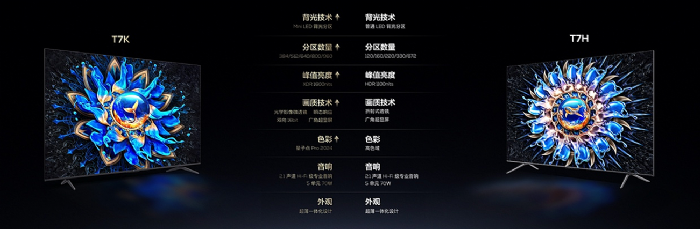 相比于T7H,T7K實(shí)現(xiàn)了從傳統(tǒng)LED電視越階成Mini LED電視,并在五大方面得到升級(jí)。