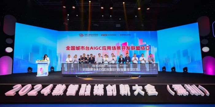大會(huì)現(xiàn)場(chǎng)還舉行了“全國(guó)城市臺(tái) AIGC 應(yīng)用場(chǎng)景開(kāi)發(fā)聯(lián)盟”成立儀式。深圳廣電集團(tuán)代表、城市聯(lián)合網(wǎng)絡(luò)電視臺(tái)聯(lián)盟代表、全國(guó)城市媒體產(chǎn)業(yè)發(fā)展聯(lián)盟代表與濟(jì)南、西寧、成都、蘇州等多家城市臺(tái)領(lǐng)導(dǎo)及有關(guān)媒體單位負(fù)責(zé)人共同按下按鈕,宣告“全國(guó)城市臺(tái) AIGC 應(yīng)用場(chǎng)景開(kāi)發(fā)聯(lián)盟”正式成立,在場(chǎng)50余家城市臺(tái)領(lǐng)導(dǎo)和嘉賓共同參與啟動(dòng)成立儀式。
