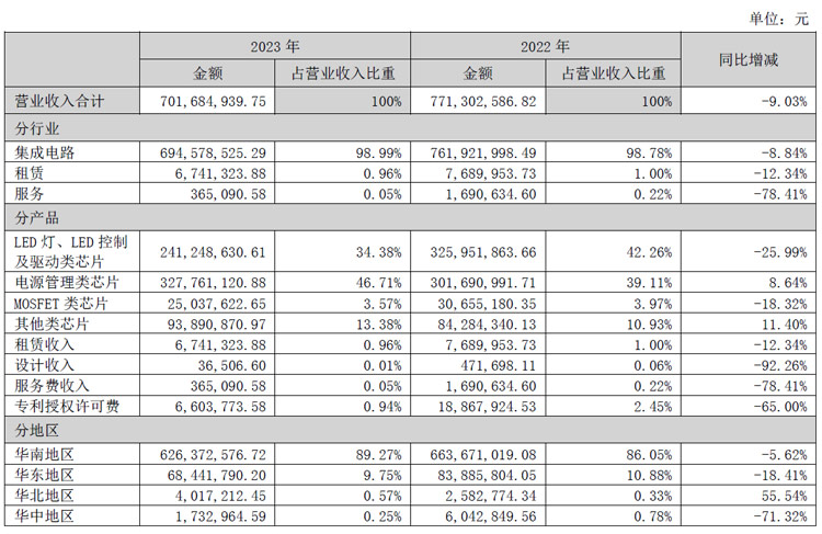 富滿微是一家專注于高性能、高品質(zhì)模擬集成電路芯片設(shè)計研發(fā)、封裝、測試及銷售的國家級高新技術(shù)企業(yè)及國家鼓勵的重點集成電路設(shè)計企業(yè)。公司產(chǎn)品分為四大類,主要涵蓋視頻顯示、無線通訊、存儲、電源管理等多項領(lǐng)域,主要產(chǎn)品為LED屏控制及驅(qū)動、MOSFET、MCU、快充協(xié)議芯片,以及各類ASIC等類芯片,產(chǎn)品可廣泛應(yīng)用于消費類電子、通訊設(shè)備、工業(yè)控制、汽車電子等領(lǐng)域,以及物聯(lián)網(wǎng)、新能源、可穿戴設(shè)備、人工智能、智能家居、智能制造、5G通訊等新興電子產(chǎn)品領(lǐng)域。報告期內(nèi),LED控制及驅(qū)動類芯片2.41億元,電源管理類芯片3.28億元。