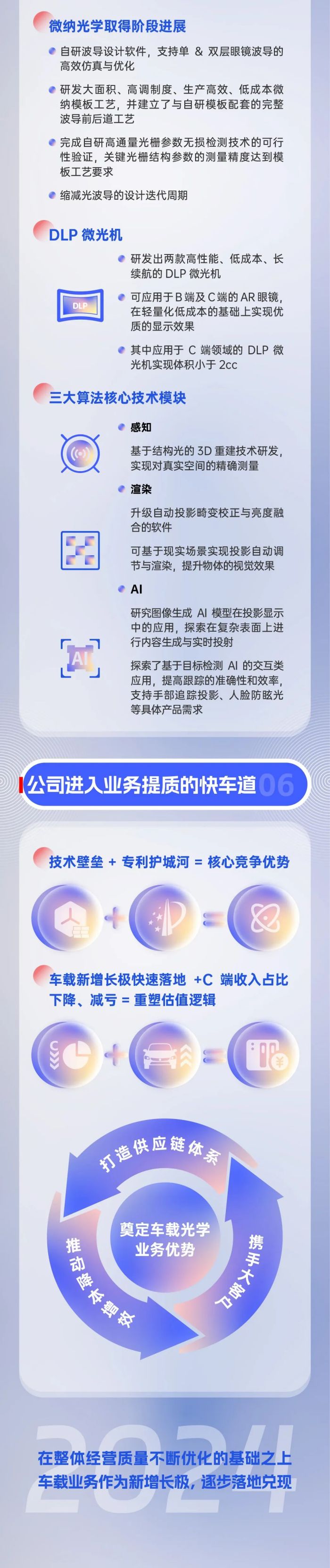 車載核心器件業(yè)務(wù)方面,為保障定點(diǎn)產(chǎn)品的高品質(zhì)交付,公司致力于打造高效穩(wěn)健的供應(yīng)鏈體系,積極配合車企的規(guī)劃推進(jìn)已獲定點(diǎn)的產(chǎn)品量產(chǎn)交付,共同實(shí)現(xiàn)定點(diǎn)車型落地;同時(shí),公司將繼續(xù)圍繞大客戶合作邏輯,充分發(fā)揮車載光學(xué)技術(shù)優(yōu)勢,積極拓展國內(nèi)外頭部車企的定點(diǎn)合作,提升公司的定點(diǎn)質(zhì)量和數(shù)量,致力成為車載光學(xué)部件的優(yōu)秀核心供應(yīng)商。
