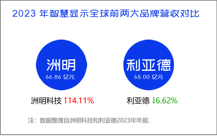據(jù)2023年洲明科技財報顯示,其智慧顯示板塊營收達到66.86億元。這一營收數(shù)據(jù)超越了其主要競爭對手利亞德2023年智慧顯示業(yè)務65.00億元的營收。作為LED直顯領域兩家世界性的領頭羊,這一數(shù)據(jù)充分表明,洲明科技在LED智慧顯示領域的“世界第一”位置。
