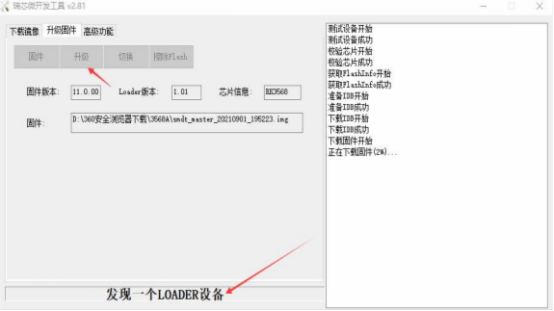 升級工具出現(xiàn)“發(fā)現(xiàn)一個 LOADER 設(shè)備”后,松開 uboot 鍵,點擊擦除Flash,擦除成功后,會有彈窗,點擊確定后,再點擊‘升級’按鈕。