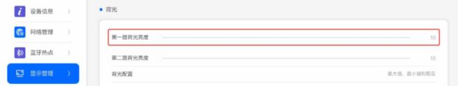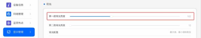 調(diào)節(jié)主屏幕背光亮度:拖動“第一路背光亮度”滑動條--調(diào)節(jié)至最左邊 ,亮度最小--調(diào)節(jié)至最右邊 ,亮度最大