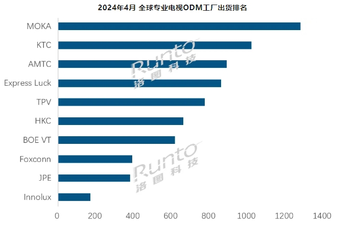 --KTC(康冠)4月出貨量約102萬臺,在專業(yè)代工廠的排名從3月的第六上升至第二,同比上漲57.0%,環(huán)比上漲70.0%。今年1-4月的累計出貨量已到達260萬臺,較去年同期大幅增長28.8%。
