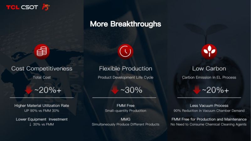 畫質(zhì)、功耗、壽命等方面的規(guī)格激進,也有力地推動TCL華星印刷OLED技術達到應用水準,在成本、投資、適應性生產(chǎn)、低碳等方面擁有競爭優(yōu)勢。