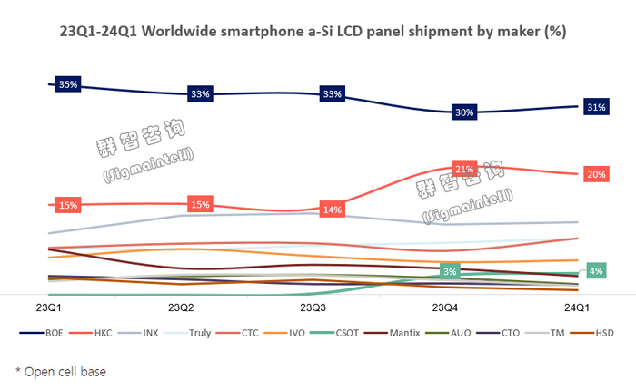 a-Si LCD方面,根據(jù)群智咨詢(Sigmaintell)數(shù)據(jù),一季度全球a-Si LCD智能手機(jī)面板出貨約2.9億片,環(huán)比下降約10.1%,同比增長約23.7%。