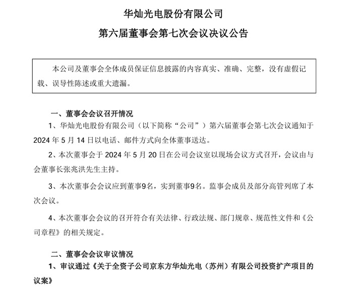 華燦光電股份有限公司發(fā)布第六屆董事會(huì)第七次會(huì)議決議公告,公告顯示本次董事會(huì)于2024年5月20日在公司會(huì)議室以現(xiàn)場(chǎng)會(huì)議方式召開,會(huì)議由與會(huì)董事長(zhǎng)張兆洪先生主持。 會(huì)議審議通過《關(guān)于全資子公司京東方華燦光電(蘇州)有限公司投資擴(kuò)產(chǎn)項(xiàng)目的議案》