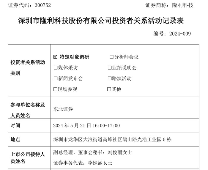 2024年5月21日,接受東北證券特定對(duì)象調(diào)研,副總經(jīng)理、董事會(huì)秘書劉俊麗女士 和證券事務(wù)代表李姝涵女士負(fù)責(zé)接待,回答了有關(guān)2023年和2024年一季度公司業(yè)績情況及公司對(duì)Mini-LED車載業(yè)務(wù)的展望問題。