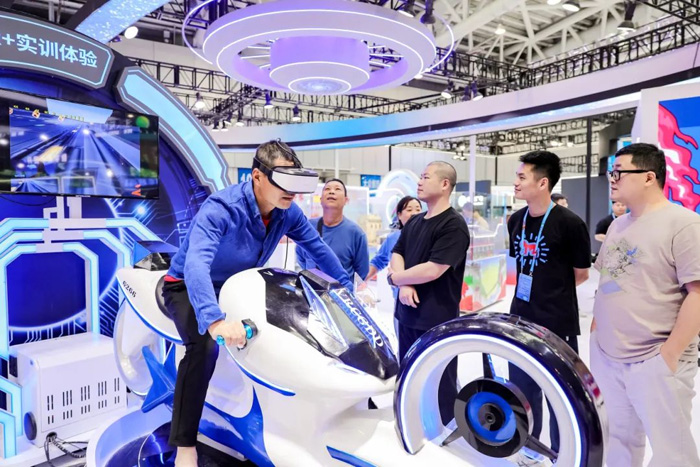 網(wǎng)龍展出的VR摩托車(chē)競(jìng)速項(xiàng)目,是網(wǎng)龍“職教出!表(xiàng)目打造的VR實(shí)訓(xùn)室設(shè)備之一