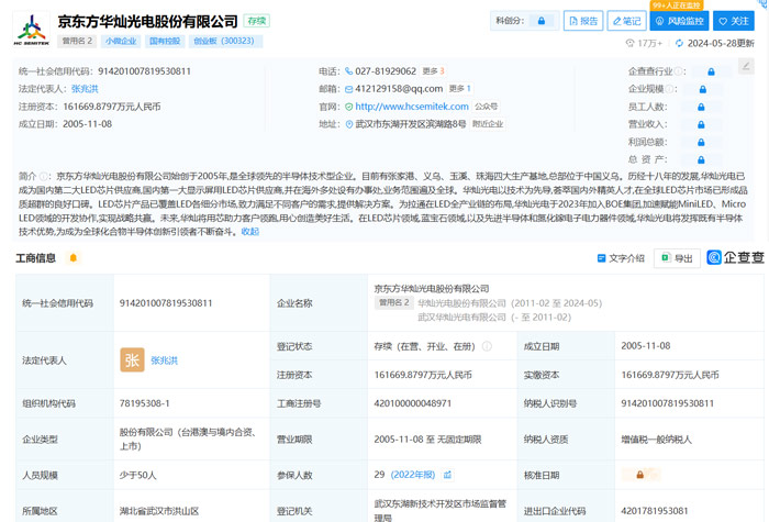 近日,華燦光電發(fā)生工商變更,公司名稱由華燦光電股份有限公司變更為京東方華燦光電股份有限公司,華燦光電最早名稱為武漢華燦光電有限公司,2011年2月變更為華燦光電股份有限公司,2024年5月變更為現(xiàn)在的京東方華燦光電股份有限公司。注冊資本也發(fā)生了變更,由之前的約12.45億人民幣增至現(xiàn)在約16.17億人民幣。