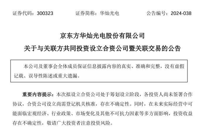 華燦光電于2024年6月6日對外發(fā)布公告稱,基于公司發(fā)展戰(zhàn)略及業(yè)務(wù)需要,擬與關(guān)聯(lián)方京東方晶芯科技有限公司(以下簡稱“晶芯科技”)共同投資設(shè)立珠海京東方晶芯科技有限公司(簡稱“珠海晶芯”)。珠海晶芯注冊資本預(yù)計 60,700 萬元人民幣,其中公司擬出資 18,200 萬元人民幣,占注冊資本的 29.98%,晶芯科技擬出資 42,500 萬元人民幣,占注冊資本的 70.02%。