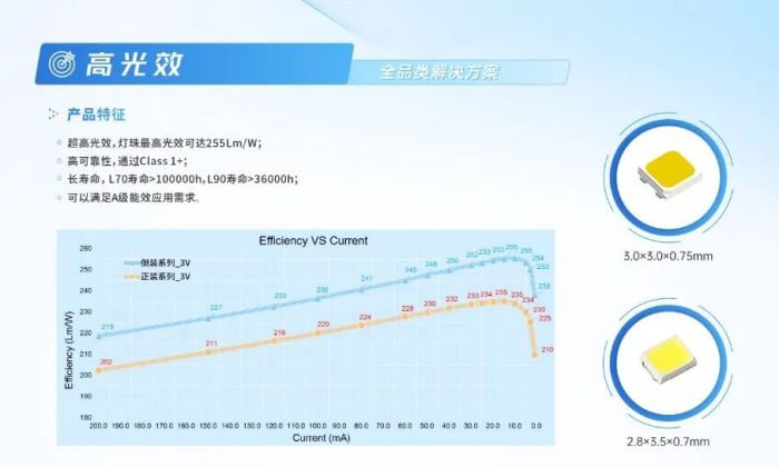 隨著全球?qū)δ茉垂?jié)約和環(huán)境保護(hù)的日益重視,高光效LED產(chǎn)品憑借低能耗、高效率等特點(diǎn)受到市場(chǎng)青睞,應(yīng)用需求持續(xù)提升。緊貼市場(chǎng)需求,國(guó)星光電全面優(yōu)化高光效全品類解決方案,方案產(chǎn)品最高光效可達(dá)255Lm/W,L70壽命>100000h,L90壽命>36000h,符合A級(jí)能效應(yīng)用標(biāo)準(zhǔn),可滿足商業(yè)照明、工業(yè)照明等對(duì)LED光效和壽命要求較高的場(chǎng)景所需,以高光效、低能耗的產(chǎn)品優(yōu)勢(shì)助力終端應(yīng)用提質(zhì)控本。
