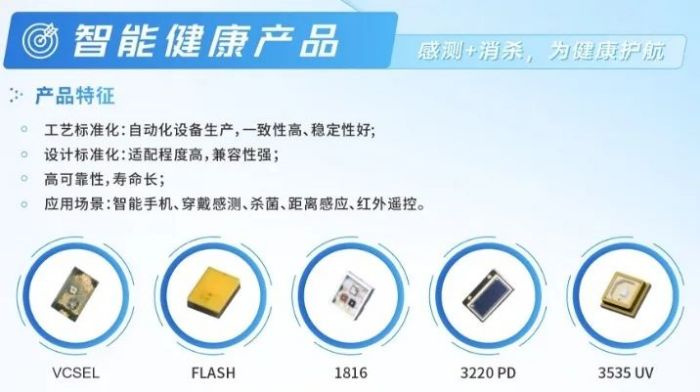 展會(huì)現(xiàn)場(chǎng),事業(yè)部展出了包括健康感測(cè)器件、紫外LED-3535器件、VCSEL發(fā)射器等智能健康產(chǎn)品,產(chǎn)品具有體積小、抗干擾性能強(qiáng)、穩(wěn)定度高等特點(diǎn),主要應(yīng)用于智能手表/手環(huán)、智能耳機(jī)等可穿戴設(shè)備;還有817光耦器件系列產(chǎn)品,產(chǎn)品已通過(guò)CQC、UL、VDE三大安規(guī)認(rèn)證,具有可靠性高、穩(wěn)定性好、綠色環(huán)保等特點(diǎn),可應(yīng)用于工業(yè)控制、儀器儀表、智能家電等場(chǎng)景。