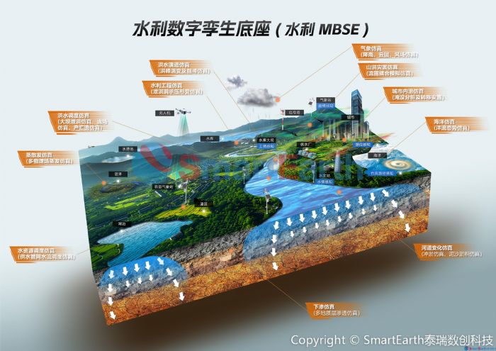 SmartEarth 水利數(shù)字孿生底座實(shí)現(xiàn)了高精地理空間數(shù)據(jù)采集、多維數(shù)據(jù)建模/加工/治理及融合、水利實(shí)體知識(shí)建模、多場(chǎng)態(tài)場(chǎng)景仿真可視化、多業(yè)態(tài)專業(yè)模型對(duì)接及實(shí)時(shí)渲染等體系化能力構(gòu)建。以基礎(chǔ)水利實(shí)體要素為骨架,通過融合工程建設(shè)、業(yè)務(wù)管理、工程運(yùn)行、感知物聯(lián)等多源多業(yè)態(tài)數(shù)據(jù),以水利實(shí)體生產(chǎn)、實(shí)體管理、實(shí)體應(yīng)用、實(shí)體仿真系統(tǒng)化能力為支撐,推進(jìn)水利業(yè)務(wù)數(shù)據(jù)結(jié)構(gòu)化、結(jié)構(gòu)語義化、語義場(chǎng)景化、場(chǎng)景孿生化、孿生資產(chǎn)化、資產(chǎn)要素化的“六化”迭代升級(jí)。SmartEarth 水利數(shù)字孿生底座是基于模型的系統(tǒng)工程方法論,構(gòu)建的水利系統(tǒng)仿真(水利 MBSE)能力體模型,驅(qū)動(dòng)新時(shí)代水利時(shí)空數(shù)據(jù)要素價(jià)值深度服務(wù)及應(yīng)用。