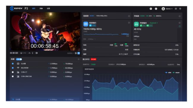 現(xiàn)場的制作和推流是在此次現(xiàn)場動態(tài)方案中的最終環(huán)節(jié)?缁ヂ(lián)網(wǎng)的制作及直播已成為現(xiàn)今AV over IP領域最必不可少的環(huán)節(jié),沒有之一,F(xiàn)場我們展示了新品P3強大的無線聚合和穩(wěn)定直播能力,以及在這一區(qū)域中,Kiloview生態(tài)對于第三方制作軟件完美的兼容能力。