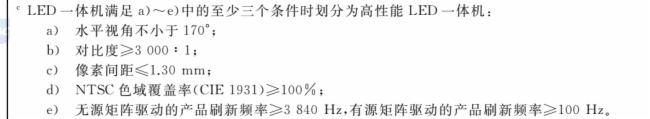 新標(biāo)準(zhǔn)規(guī)定了LED一體機的標(biāo)準(zhǔn)測試狀態(tài)以及能效相關(guān)測試方法。針對高性能LED一體機,新標(biāo)準(zhǔn)從水平視角、對比度、像素間距、色域覆蓋率、刷新頻率五個方面來劃分高性能產(chǎn)品。高性能LED一體機需至少滿足三個條件,且能源效率至少需≥2.7 cd/W才可認(rèn)證為高性能LED一體機一級能效。