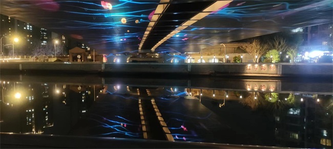 然而,江寧路橋底面為光面,反光嚴重,為項目增加了障礙。為了解決這一問題,團隊采取了多種措施:包括使用磨砂漆減少反射,更改鏡頭以優(yōu)化投影效果,并在關鍵點位策略性地堆疊投影機,確保畫面亮度一致。此外,為了抵御河邊的潮濕環(huán)境,還使用了定制戶外恒溫箱來保護投影設備。
