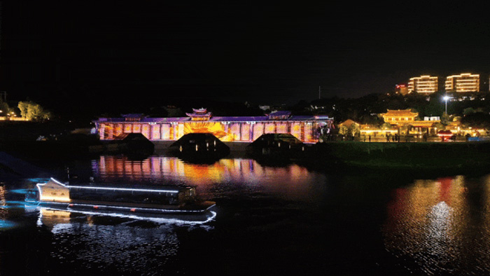 橋體下方由特殊的繩索或網(wǎng)狀材料作為投影幕布,為投影畫面增添了更多的層次和變化。故事接近尾聲,繩幕緩緩拉起,游船從橋下穿過,為文祥湖夜游增添上一份神秘與浪漫。