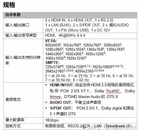 今天為大家?guī)?K60無縫矩陣系列,支持及時(shí)切換以及自由倍線到4K@60Hz SDR和HDR。支持三種工作模式:矩陣切換模式、多畫面模式和視頻墻拼接模式。矩陣切換模式支持4個(gè)HDMI源無縫切換給4個(gè)HDMI輸出。多畫面模式支持五個(gè)布局:Original模式、Dual view模式、PIP模式、Master模式和Quad模式。視頻墻模式支持2x2的視頻墻連接,可以選擇任意源作為輸入,也可以設(shè)置邊框校正和畫面翻轉(zhuǎn)。除了靈活的視頻功能,同時(shí)提供輸出1和2的模擬和數(shù)字S/PDIF音頻剝離輸出功能。具有多種控制模式:前面板控制、紅外、RS232,web UI以及TCP協(xié)議。在需要4K無縫切換的場合是絕佳的選擇。