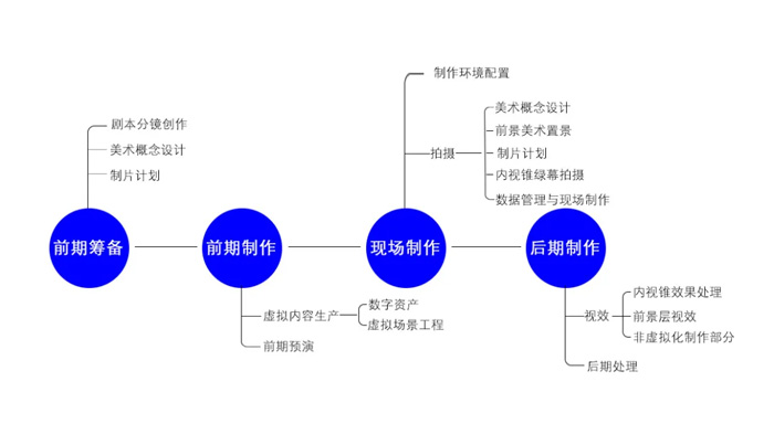 在LED影棚虛擬制作中,“VP攝影棚”與“XR延展影棚”的整個(gè)拍攝流程大致相同,分為前期籌備、前期制作、現(xiàn)場制作、后期制作四個(gè)部分。